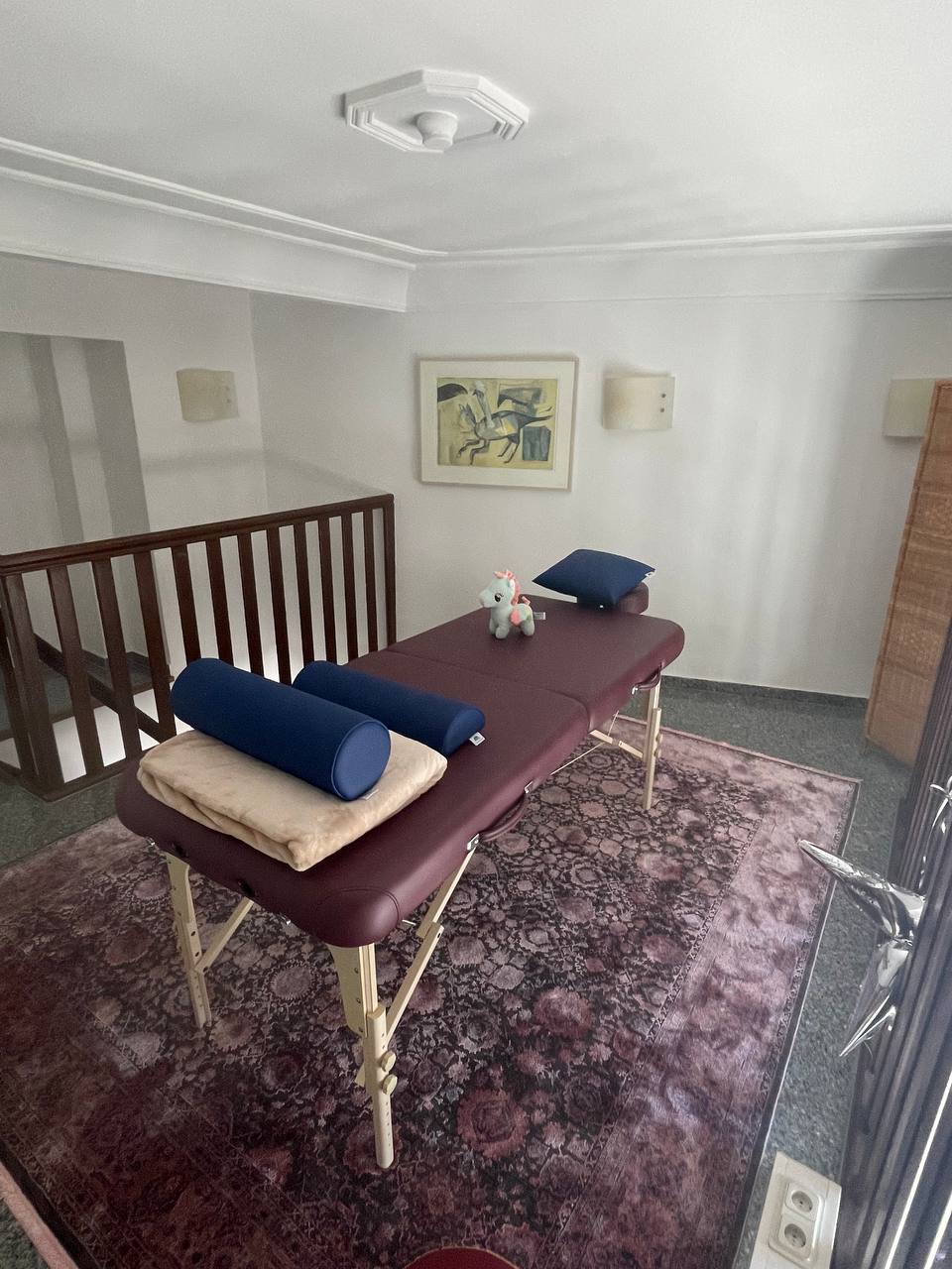 Vom Galerieraum geht es eine Treppe nach oben in die zweite Ebene. Dort gibt es die vielfältigsten medizinischen Körpertherapien (Physiotherapie, Akupressur, Entspannungstherapien, Energiearbeit u. v. m.) Im zweiten Heilraum finden Gespräche zwischen den Klientinnen und Klienten /Patienten sowie der Therapeutin statt.