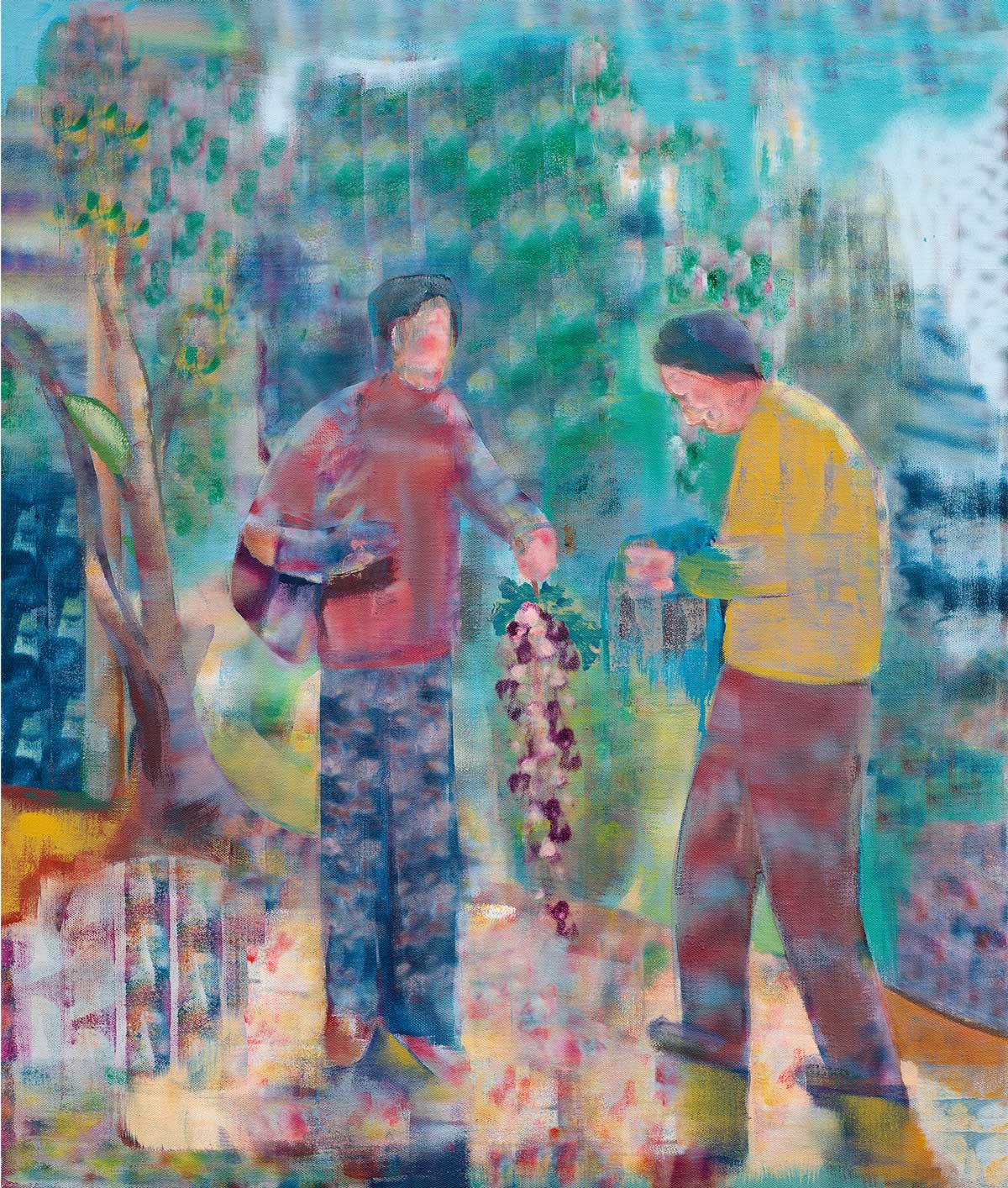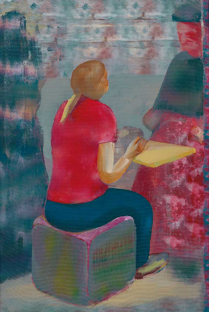 In seinen neusten Arbeiten verschränken sich Figur, Formen und Grund. Flächen laufen ineinander, abstrakte Formen werden zu Körpern, klare Kanten verschwimmen, Räume lösen sich auf und finden sich neu. In Leinwand füllenden Texturen wird Vordergrund zu Hintergrund und umgekehrt. Räumliche Tiefe verschwindet und taucht mit wechselnder Lesrichtung anders wieder auf. Rakelstrukturen blenden in diffuse Rapports, sich wiederholende bunte Farbwolken, die auf ihrem Weg über die Leinwand mäandern. Alles verbindet sich zu einer flächigen Textur. Locker und scheinbar beiläufig, unangestrengt. Das Abstrakte balanciert mit dem angedeutet Gegenständlichen. Ein Palimpsest übereinander liegender Andeutungen. Als ob der gleiche Text in unterschiedlichen Sprachen gelesen werden kann. Wir hören Töne, die Musik aber entsteht in uns.
